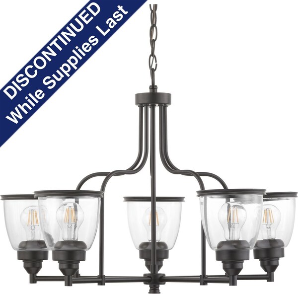 The Saluda Collection features a gently curving frame paired with clear glass shades. Each shade is accented with a banded ring to carry through the theme of finely crafted metal fittings. The design lends itself to Farmhouse, Coastal and Transitional spaces. Five-Light chandelier in a Antique Bronze finish. Five-Light chandelier in a Antique Bronze finish.