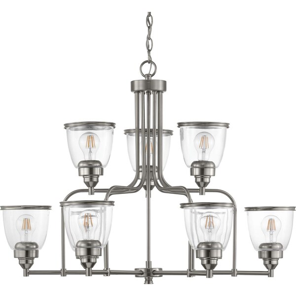 The Saluda Collection features a gently curving frame paired with clear glass shades. Each shade is accented with a banded ring to carry through the theme of finely crafted metal fittings. The design lends itself to Farmhouse, Coastal and Transitional spaces. Nine-Light chandelier in a Brushed Nickel finish. Nine-Light chandelier in a Brushed Nickel finish.