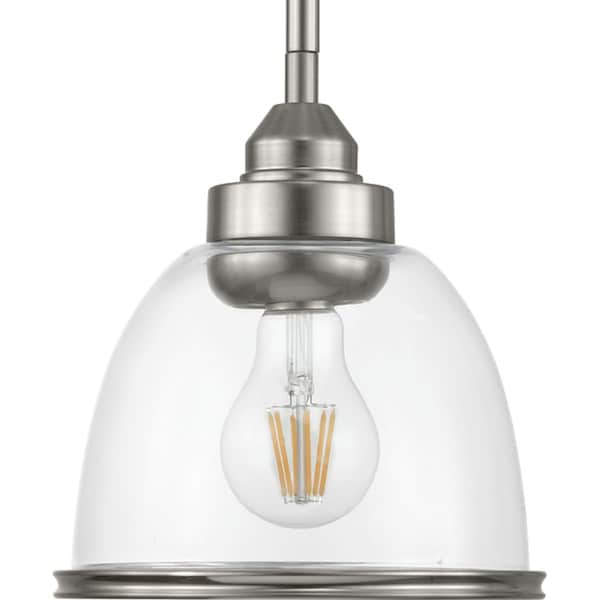 The Saluda Collection features a gently curving frame paired with clear glass shades. Each shade is accented with a banded ring to carry through the theme of finely crafted metal fittings. The design lends itself to Farmhouse, Coastal and Transitional spaces. One-Light mini-pendant in a Brushed Nickel finish. One-Light mini-pendant in a Brushed Nickel finish.