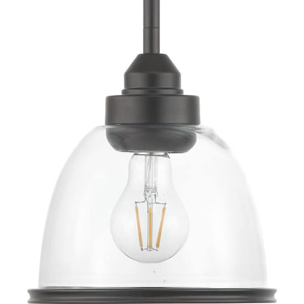 The Saluda Collection features a gently curving frame paired with clear glass shades. Each shade is accented with a banded ring to carry through the theme of finely crafted metal fittings. The design lends itself to Farmhouse, Coastal and Transitional spaces. One-Light mini-pendant in a Antique Bronze finish. One-Light mini-pendant in a Antique Bronze finish.