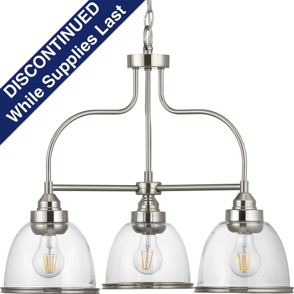 The Saluda Collection features a gently curving frame paired with clear glass shades. Each shade is accented with a banded ring to carry through the theme of finely crafted metal fittings. The design lends itself to Farmhouse, Coastal and Transitional spaces. Three-Light chandelier in a Brushed Nickel finish. Three-Light chandelier in a Brushed Nickel finish.