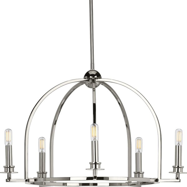The airy, open-cage design of the Seneca five-light chandelier makes it an excellent choice for providing a welcoming glow to guests in an entryway or as they enjoy a meal at a dining table to kitchen island. Clean, Polished Nickel arms flow down from the orb crowning the fixture. Classic candelabra lights play along the fixture’s smooth, round base, making it an elegant choice for modern farmhouse and luxe interiors.