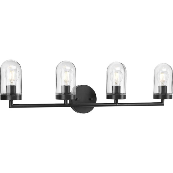 Celebrate a blend of industrial flavor and modern sensibility with the Signal four-light bath. A stunning quartet of clear, blown glass shades each harbor their own exposed light bulb. A long, Graphite-finished bar and circular backplate finish off this flawless design, making to fit to exile shadows from any hallway, bathroom or dressing table mirror, or wherever task light is desired.