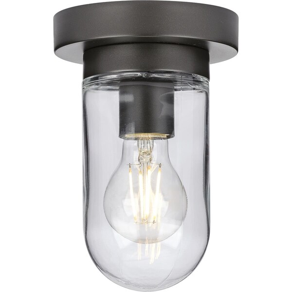 A clear, blown glass shade paired with clean lines speak to the modern attitude of the Signal one-light flush mount. A Graphite-finished, circular ceiling plate hints at the fixture’s industrial origin, making it a flawless fixture for illuminating a bustling kitchen island or sink, an often-traveled hallway, or wherever focused task lighting is desired in coastal, modern farmhouse, and modern interiors.