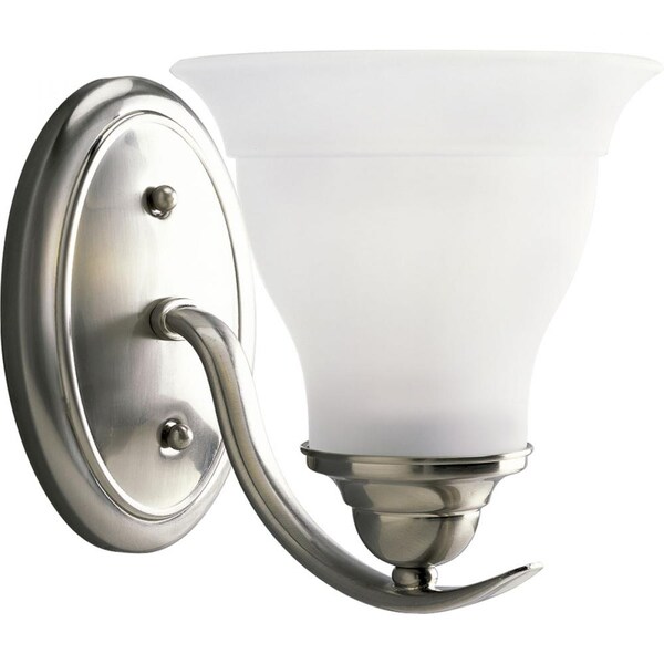 One-light bath fixture featuring soft angles, curving lines and etched glass shades that mount up or down. Gracefully exotic, the Trinity Collection offers classic sophistication for transitional interiors. Sculptural forms of metal and glass are enhanced by a classic finish. This transitional style can transform a room or your whole home with its charming versatility.