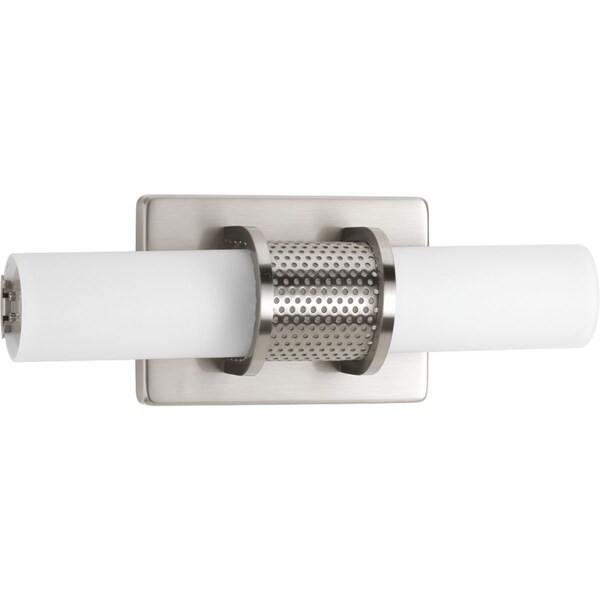 A tubular design pairs with a geometric back plate and mesh accents to create Truss - a 13" fixture than can be mounted horizontally or vertically. Circular etched opal glass contains an integrated LED source to provide a variety of energy and cost savings benefits for the homeowner. Modern style and continuous illumination are ideal for a variety of bath and vanity settings. LED source features 3000K and 90+ CRI benefits, as well as a lifespan of more than 42,000 hours. Brushed Nickel finish.