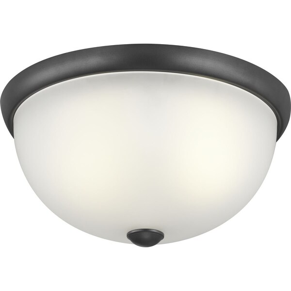 A classic two-light 14in flush mount fixture with dome shaped etched glass, solid trim and decorative knob. The Graphite finish complements a variety of interior settings, such as Modern, Traditional and Farmhouse.