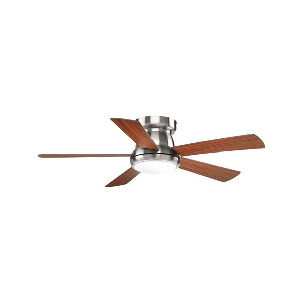 Five-blade 56” Vox Hugger ceiling fan features an LED light source, offering both form and function with energy- and cost-savings benefits. A shatterproof, white opal shade contains a 17W dimmable, 3000K LED module. A remote control with batteries is included. The fan mounts close to the ceiling .