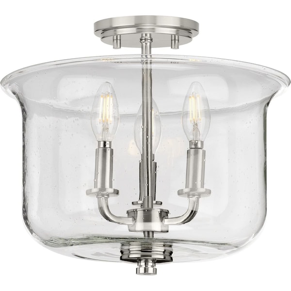 Immerse yourself in a home atmosphere primed for relaxation and inspired thinking with the beautiful craftsmanship of this semi-flush mount. Savor this fresh take on a classic light choice as your gaze traces graceful arms and clean, crisp lines coated in a gorgeous brushed nickel finish. Lightly seeded glass shade rest in shiny pedestal light bases that add an unexpected, but welcomed dash of modern personality to this clean, traditional design.