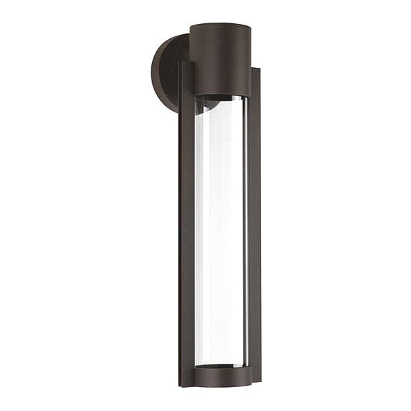 A modern outdoor LED sconce with an architectural-inspired open linear frame and clear glass diffuser. Finished in Antique Bronze.