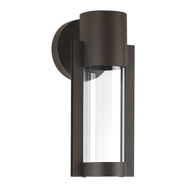 A modern outdoor LED sconce with an architectural-inspired open linear frame and clear glass diffuser. Finished in Antique Bronze.