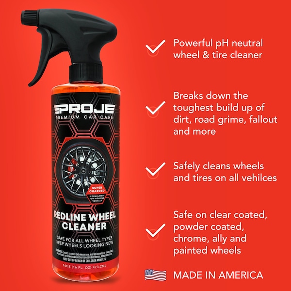 The Redline wheel cleaner is a powerful all-purpose cleaner that gets right into your wheel wells to break down the toughest build-ups of dirt, brake dust, and grease. Redline wheel cleaner is safe, versatile, and extremely powerful. It is crucial to thoroughly saturate the area you want to clean. The solution works best when a complete covering on your wheel has been established. Work out of direct sunlight. We recommend you wear gloves during the entire process.