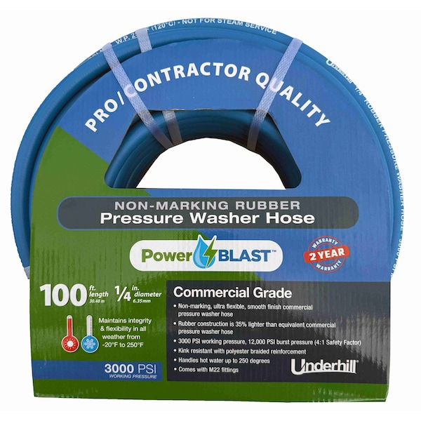Built tough for commercial use. These 1/4" diameter hoses handle 3000 psi working pressure and 12,000 psi burst. Non-marking, flexible, lightweight, and hot water rated up to 250°F. Includes M22 fittings.