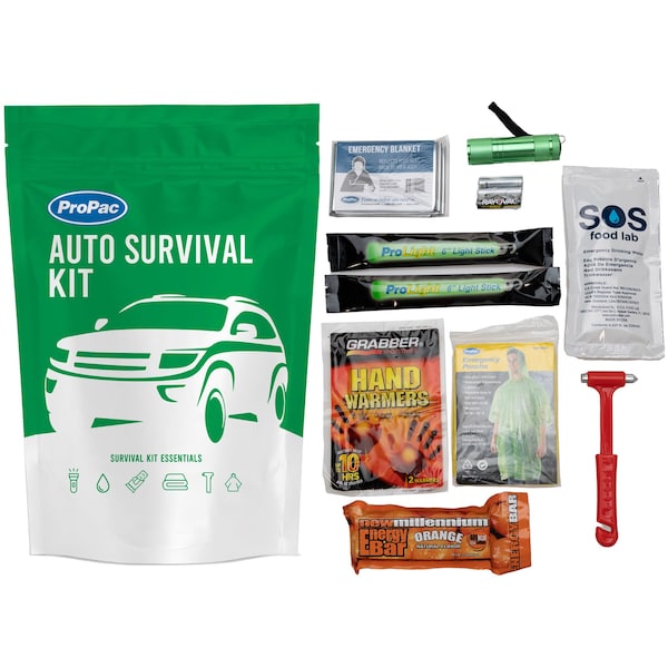 The new ProPac Auto Safety Pouch Kit provides essential items in case you're stranded on the road.Compact standup pouch design fits easily into the glovebox.Resealable, moisture resistantPouch features see-through back to find what you need fast!Measures 7.5 in. W x 11.75 in. H x 2.5 in. DProduct Weight: 14.5 ozCar Survival Kit Contents400 Cal Power BarDrinking Water PacketRain PonchoEmergency Blanket2 Lightsticks9 LED Flashlight, durable metal case, AAA Batteries includedHand WarmerCar Glass Breaking Tool