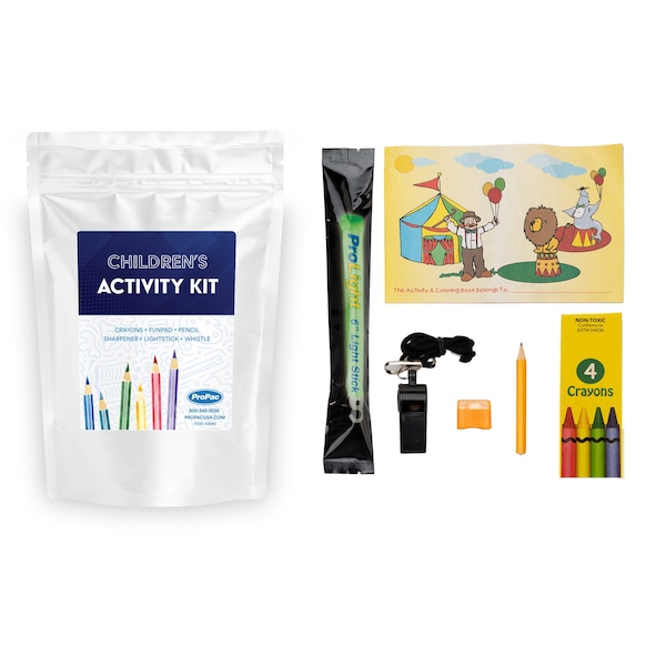 This activity kit is just for kids. The children's kits include crayons, coloring book, lightstick and several other fun activity products in a handy standup pouch bag.Fun Activity Items:LightstickCrayonsColoring bookPencil and sharpener