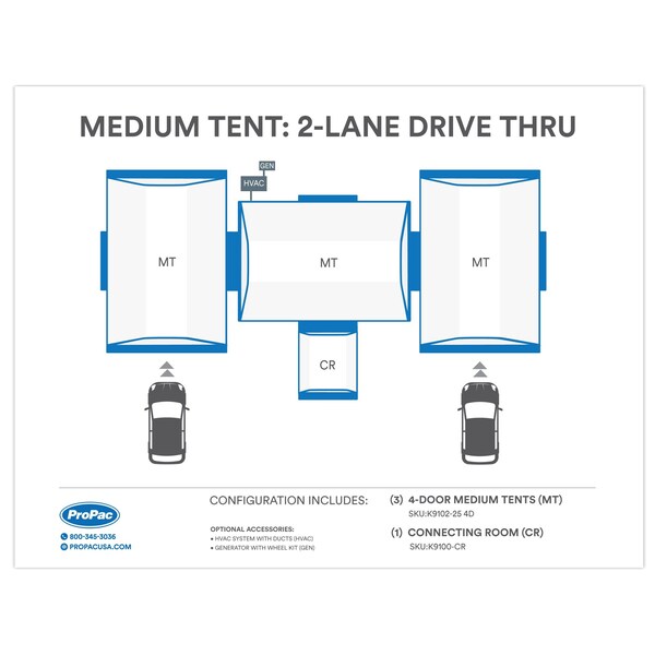 The ProPac Double Lane Drive Through Tent incorporates 3 Medium 4-Door Tents and a single Connecting Room. This allows for a convenient H layout providing 2 Drive Through Lanes and a single administrative tent. The tents inflate within 5 to 10 minutes and come equipped with a UL-rated 15,000 Lumen LED String Lighting System and all necessary accessories for immediate operation. Flexible roll-up door openings allow for a generous 76 for foot traffic while a removable Oxford wall divides the interior space. Equipped for HVAC support with an easy-to-use air plenum and ducts designed for efficient air distribution. Compliant with CPAI-84/CSFM fire standards, the double hook and loop strapping system on the door exteriors enables tents to interconnect seamlessly while preventing moisture from compromising door seals.