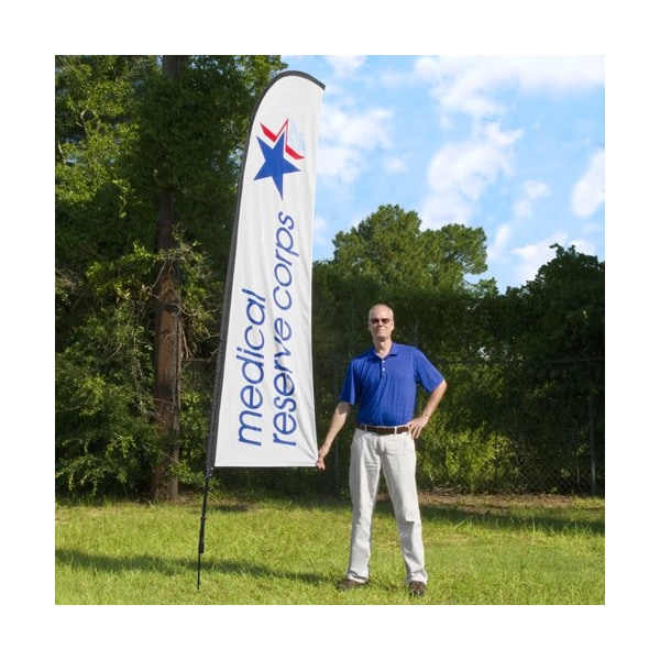 Get noticed in a big, bold way! Our new feather flag with vivid color MRC graphics tops at out over 10 feet off the ground! Sets up fast. Complete kit includes flag, ground anchor stake and carry case.