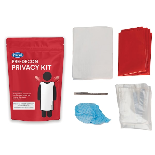 The Pre-Decon Kit is designed to provide patients safety and privacy before a decontamination event. The kit, which comes in a zip-close pouch includes bags to hold personal items and a privacy poncho and shoe coverings to wear during decontamination. Contents:Privacy PonchoShoe CoversContaminated Clothing BagPersonal Effects BagPenTowelPouch Size: 10 in. W x 14 in. H