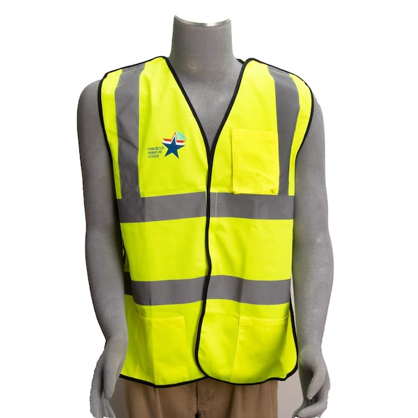 This durable full size vest is made of polyester knit and features 5 break-away points! It has velcro closures at the front, shoulders and sides and meets ANSI Class 2 requirements. MRC logo on front and back. It includes three pockets, including one for radio/cell phone. One size fits most.
