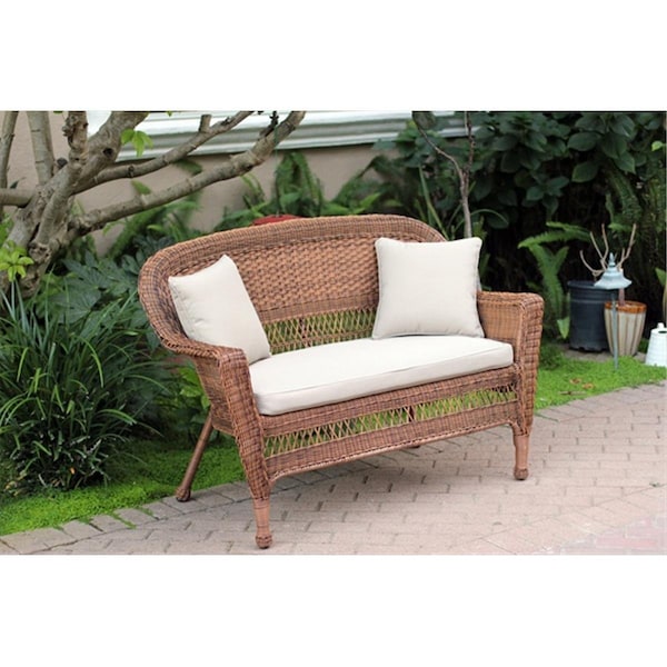 Honey Wicker Patio Love Seat With Tan Cushion And Pillows (Discontinued)