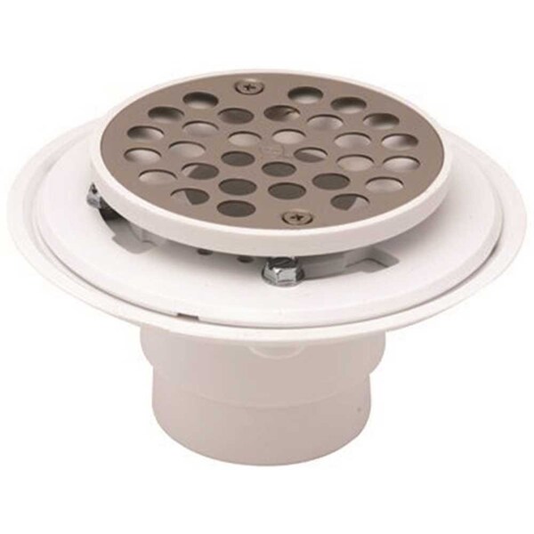 Designed for Use on Built-up Shower Bases. Durable PVC White. Fits over 2 in. or Inside of 3 in. Sch.40 DWV Pipe. Screw-in Round Stainless Steel Strainer.