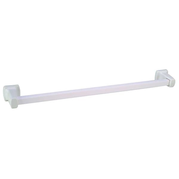 The Lenape White Ceramic Towel Rack measures 24 in. long. The two high-fired white glazed ceramic posts are easily wall mounted with the included hardware. The 24 inch white plastic towel bar can be cut to your exact size with a fine tooth saw.
