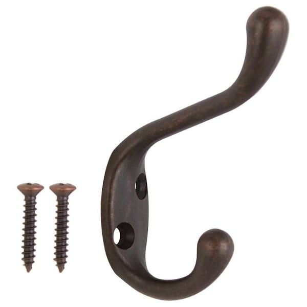 Coat and Hat Hook, 22 lb, 2-Hook, 1-1/64 in Opening, Zinc, Venetian Bronze