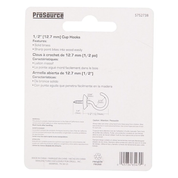 Cup Hook, 3/16 in Opening, 2.5 mm Thread, 3/4 in L, Brass, Brass