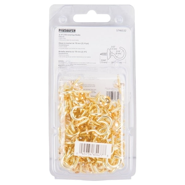 Cup Hook, 5/16 in Opening, 3 mm Thread, 1-1/8 in L, Brass, Brass