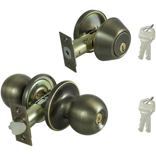 Deadbolt and Entry Lockset, Turnbutton Lock, Saturn Design, Antique Brass, 3 Grade, Brass