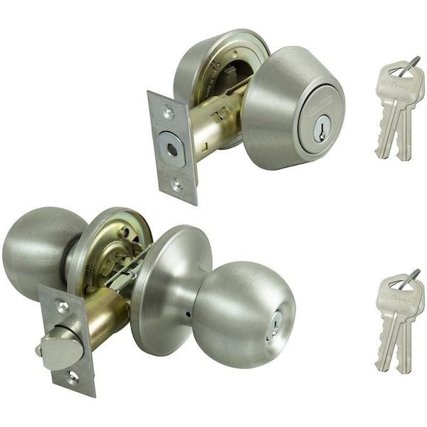 The combination lockset entry lockset and deadbolt lock or unlock by key outside and turn piece inside. All-metal components.