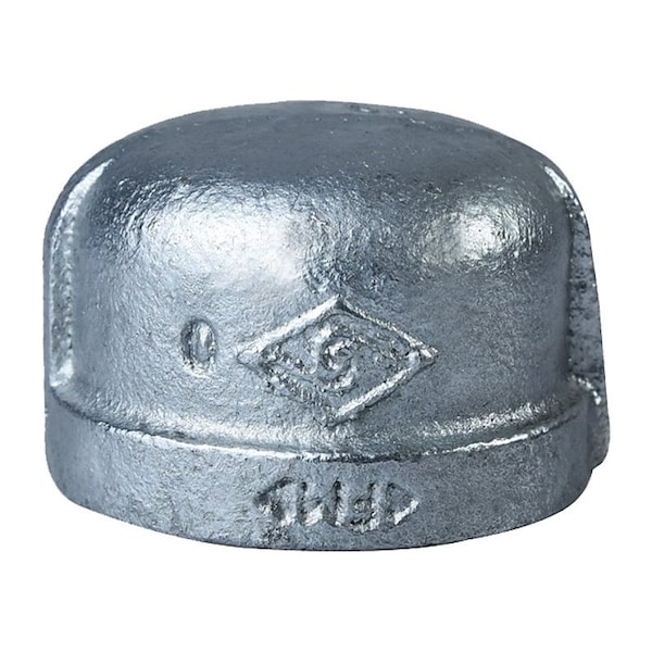 The galvanized cap is a class 150 malleable iron pipe fitting that is used for closing and terminating the male end of a pipe or fitting