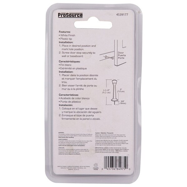 Heavy-Duty Rigid Door Stop, 1 in Dia Base, 3 in Projection, Die-Cast Zinc & Plastic, White