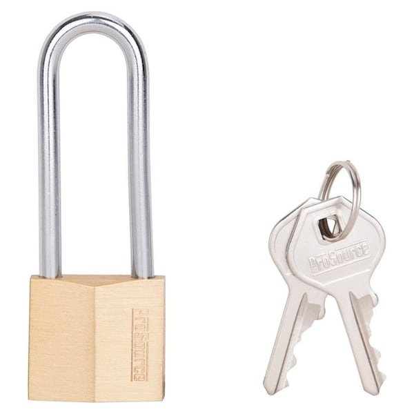 The ProSource padlock is ideal for high security. It has a brass tumbler with a hardened steel shackle and two brass keys are included.