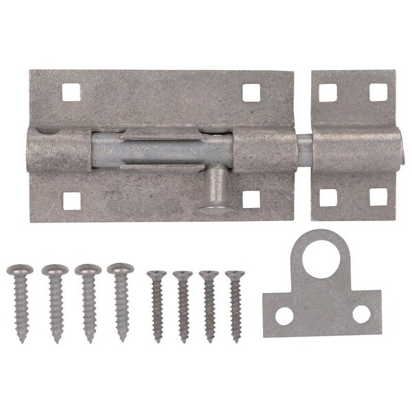ProSource Padlockable Barrel Bolt, Bolt Head Size: 0.31 Dia in, Bolt Length: 6 in, Throw Size: 1.83 in, Galvanized Steel, Galvanized Zinc Plated, Number of Mounting Holes: 4+4, 4.57 in L, 2.7 in W, 0.9 in H, Includes: Fasteners