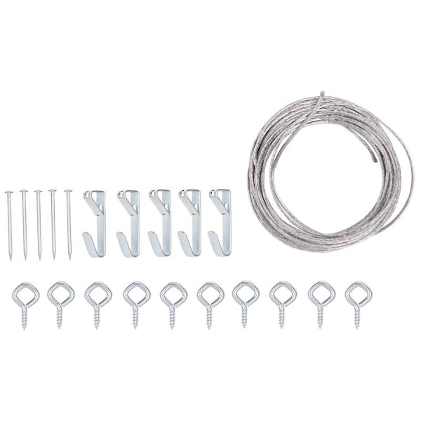 Use for drywall/plaster wall surfaces. 20 lb weight, steel, zinc plated finish. Included: 5 hangers, 5 nails, 10 eyes, and 15 ft #3 picture wire.