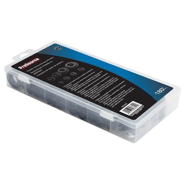 ProSource Plastic Grommet Assortment is used in plumbing, automotive and various applications. The assortment includes 180 pieces neatly organized in a divided PVC storage case.