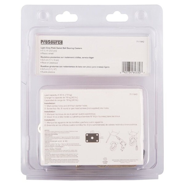 Swivel Caster, 1-1/4 in Dia Wheel, 1/2 in W Wheel, Plastic Wheel, Black, 40 lb