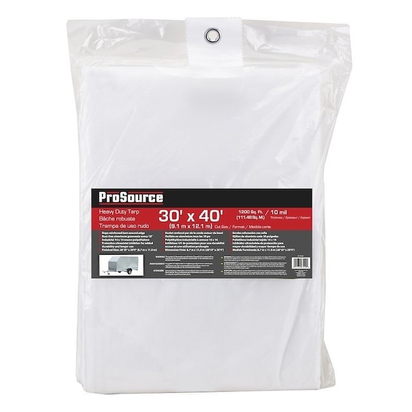 ProSource Tarp, Plastic, White, 40 ft L, 30 ft W, 10 mil Thick, Grommet Spacing 18 in, Grommet Material Aluminum, Resists Sunlight, Tear, UV Rays, Water, Suitable for Camping, hunting, tent fly, storage cover, canopy, boat cover, woodpile cover