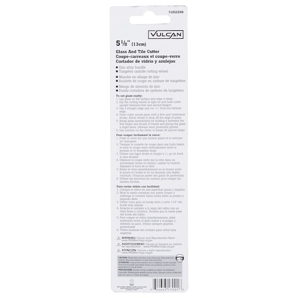 The Vulcan tile and glass cutter can be used to cut tile and glass The handle is made of zinc alloy and the cutting wheel is made of tungsten carbide