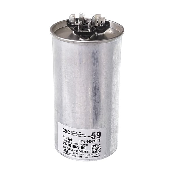 Motor Dual Run Capacitor, Dual Run Capacitor, Round, 440V AC, Microfarad Rating 70/5 MFD, Overall Height 5 3/8 in, Case Material Aluminum