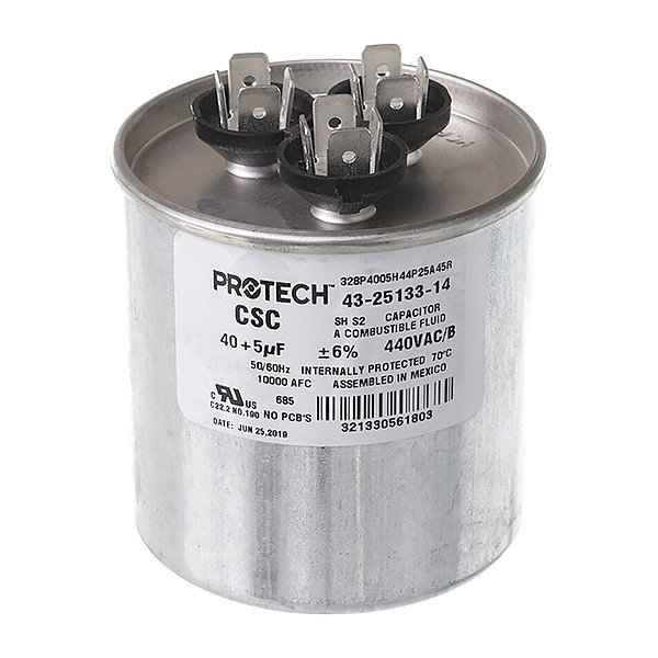 Motor Dual Run Capacitor, Dual Run Capacitor, Round, 440V AC, Microfarad Rating 40/5 MFD, Overall Height 3 3/4 in, Case Material Aluminum
