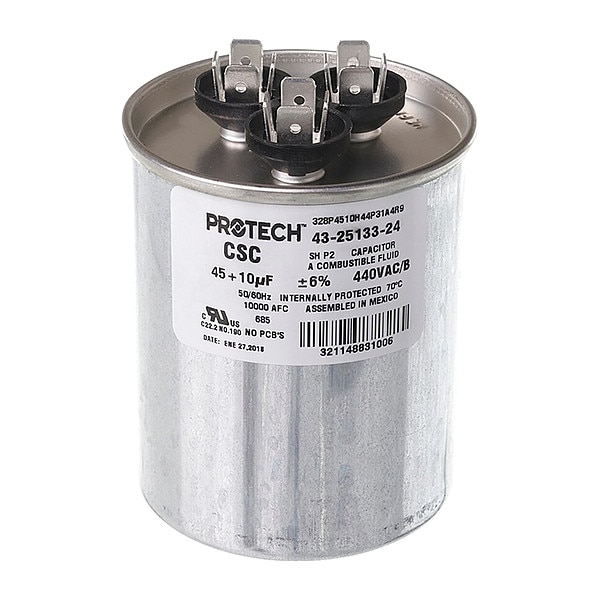 Motor Dual Run Capacitor, Dual Run Capacitor, Round, 440V AC, Microfarad Rating 45/10 MFD, Overall Height 4 3/4 in, Case Material Aluminum