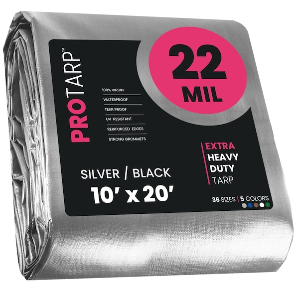Heavy Duty Tarp, 10 ft x 20 ft, 22 Mil, Silver/Black, Polyethylene, Waterproof, Rip and Tear Proof