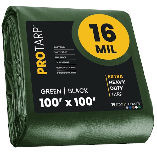 Heavy Duty Tarp, 100 ft x 100 ft, 16 Mil, Green/Black, Polyethylene