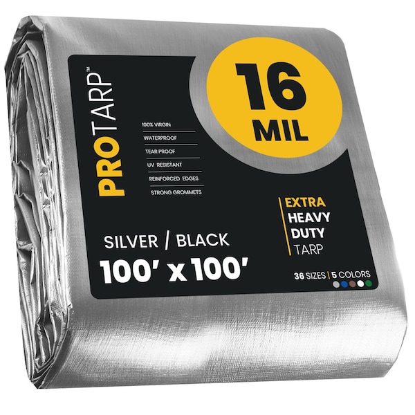 Heavy Duty Tarp, 100 ft x 100 ft, 16 Mil, Silver/Black, Polyethylene