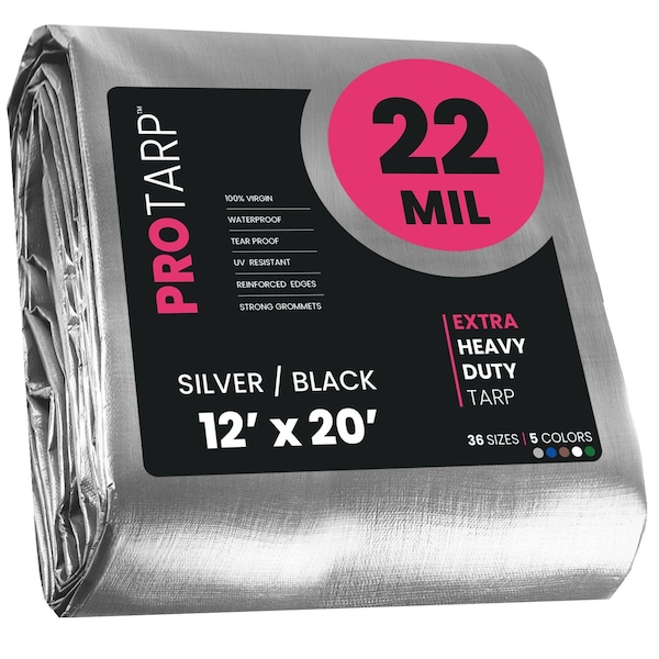 Heavy Duty Tarp, 12 ft x 20 ft, 22 Mil, Silver/Black, Polyethylene, Waterproof, Rip and Tear Proof