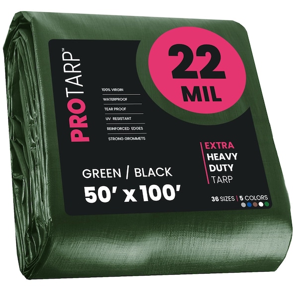 Heavy Duty Tarp, 50 ft x 100 ft, 22 Mil, Green/Black, Polyethylene