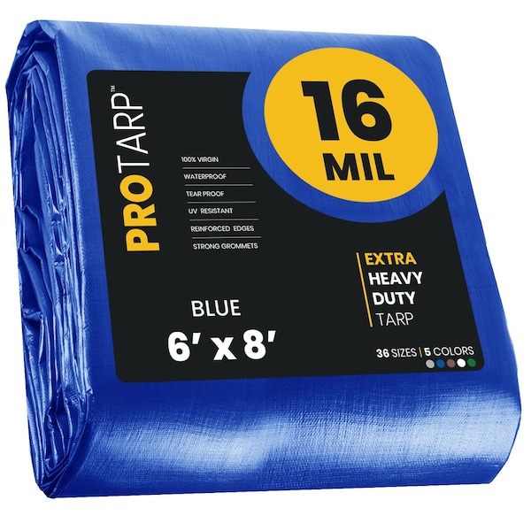 Heavy Duty Tarp, 6 ft x 8 ft, 16 Mil, Blue, Polyethylene, Waterproof, Rip and Tear Proof