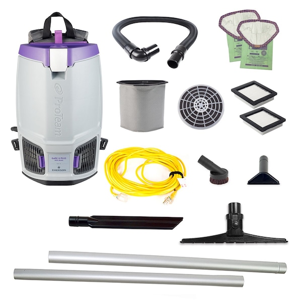 ProTeam's newest lineup of commercial backpack vacuums, the GoFit Series, includes a 6 qt. PLUS version. Like the small and larger quart options, this medium-sized tool is comfortable while providing maximum floor cleaning productivity and efficiency. Since ergonomics are crucial for experiencing comfort, the GoFit 6 qt. PLUS features a 4-step FlexFit articulating harness. Inspired by top-rated backpacks beloved by hikers worldwide is designed to rest comfortably on the user's hips for hours of wear. Additionally, the FlexFit harness's purple numbered touchpoints provide a customized, quick-adjust fit that doesn't require tools. And, with more freedom to move because of its close-fitting profile, you'll bump into fewer objects as you work. The ProLevel Filtration System with HEPA Media helps reduce allergens and asthma triggers found in the indoor environment and captures 99.82% at 0.3-5 microns per ASTM F3150. When it comes time to change out the filters, to ensure maximum efficiency, you'll find one hand is all you need with the newly designed hinged lid with a single, durable, quick-release, die-cast aluminum latch for easy access. Unique to the 6 qt. PLUS is a filter change indicator light that shows when there's a clog or when the filter needs to be checked/changed. Includes 15" Carpet Sidewinder Tool Kit 106820: 15" carpet Sidewinder tool (106245), 59" two-piece friction-fit straight aluminum wand (105693), 17" crevice tool (100108), 3" dust brush (100110), 5" upholstery tool (100115) plus 2 filter bags (107314) and a 50' power cord (101678). Use filter bags open collar #107314 or closed collar #107374.